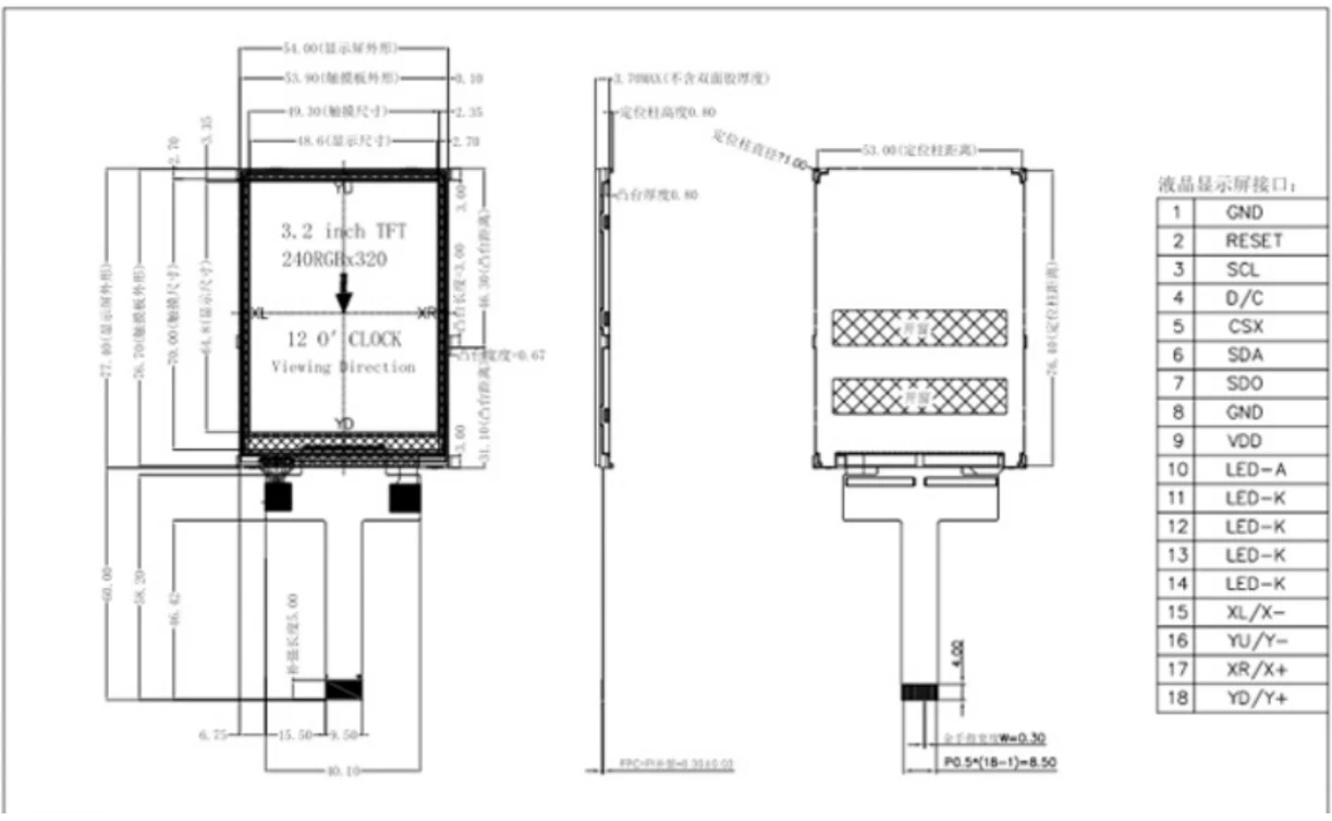 3,2-palcový širokouhlý IPS TFT modul s malým TFT dotykovým displejom je vybavený 4-vodičovým sériovým rozhraním SPI, ktoré uľahčuje integráciu do rôznych dizajnov. Jeho kompaktné rozmery 54,00 × 77,40 × 3,70 mm (Š × D × H) sú ideálne pre zariadenia s obmedzeným priestorom, zatiaľ čo jeho aktívna plocha displeja 48,60 × 64,80 mm vyvažuje veľkosť displeja a prenosnosť, vďaka čomu je ideálnou voľbou pre priemyselné ovládacie panely, ručné testery a spotrebnú elektroniku.